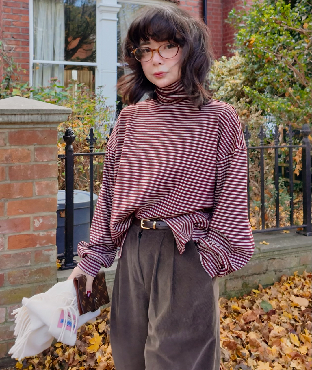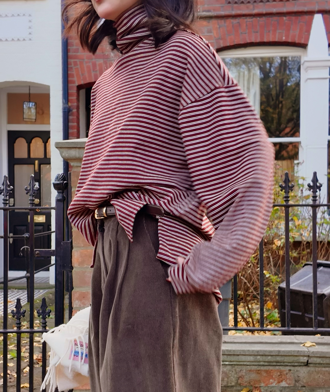 A boxy-fit funneled neck featuring in classic burgundy stripes.