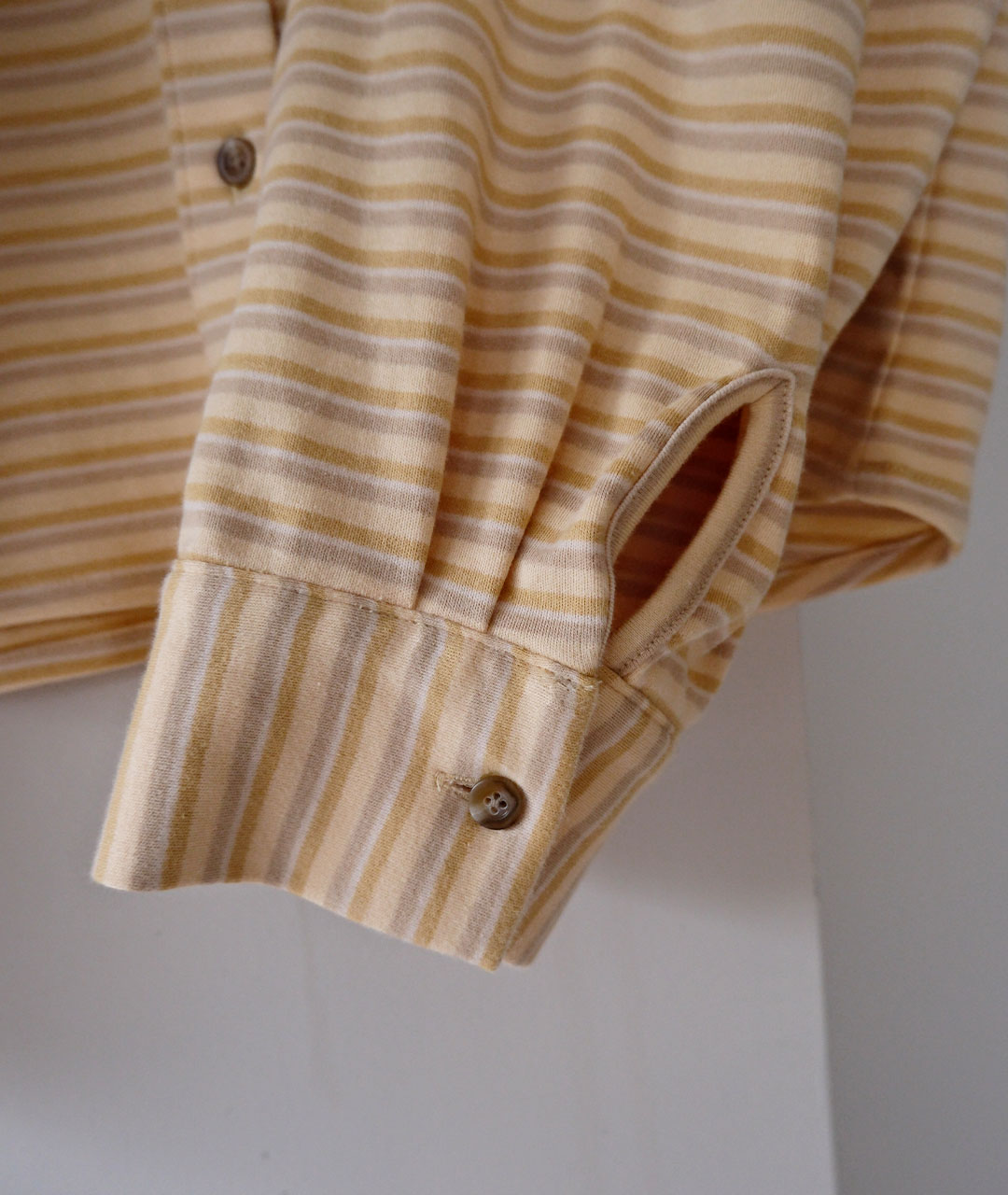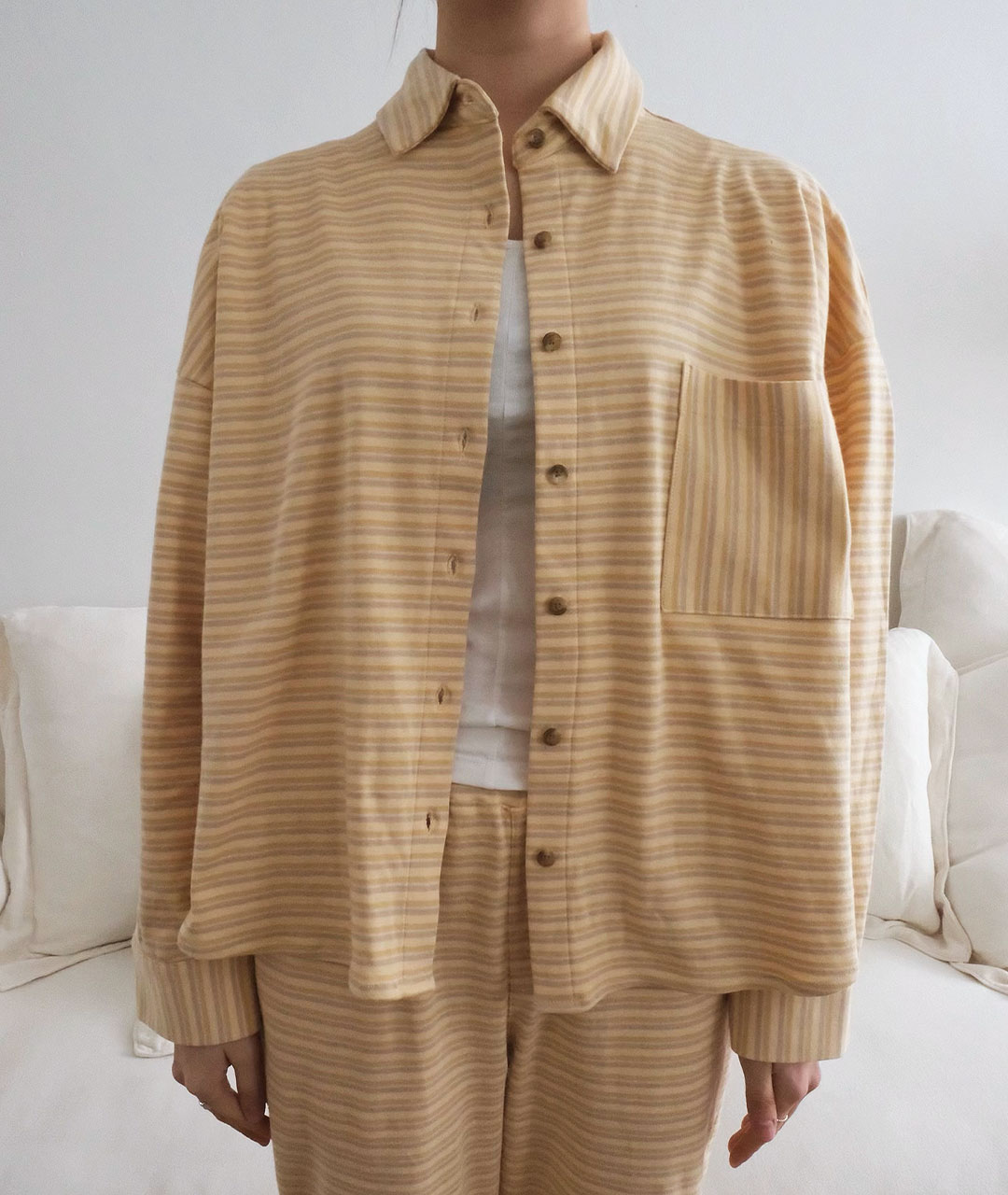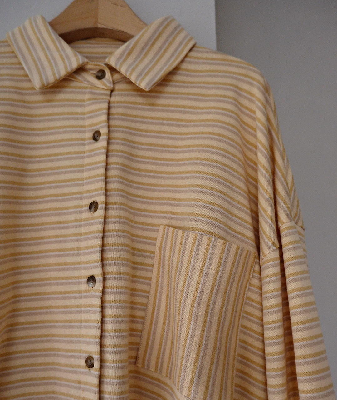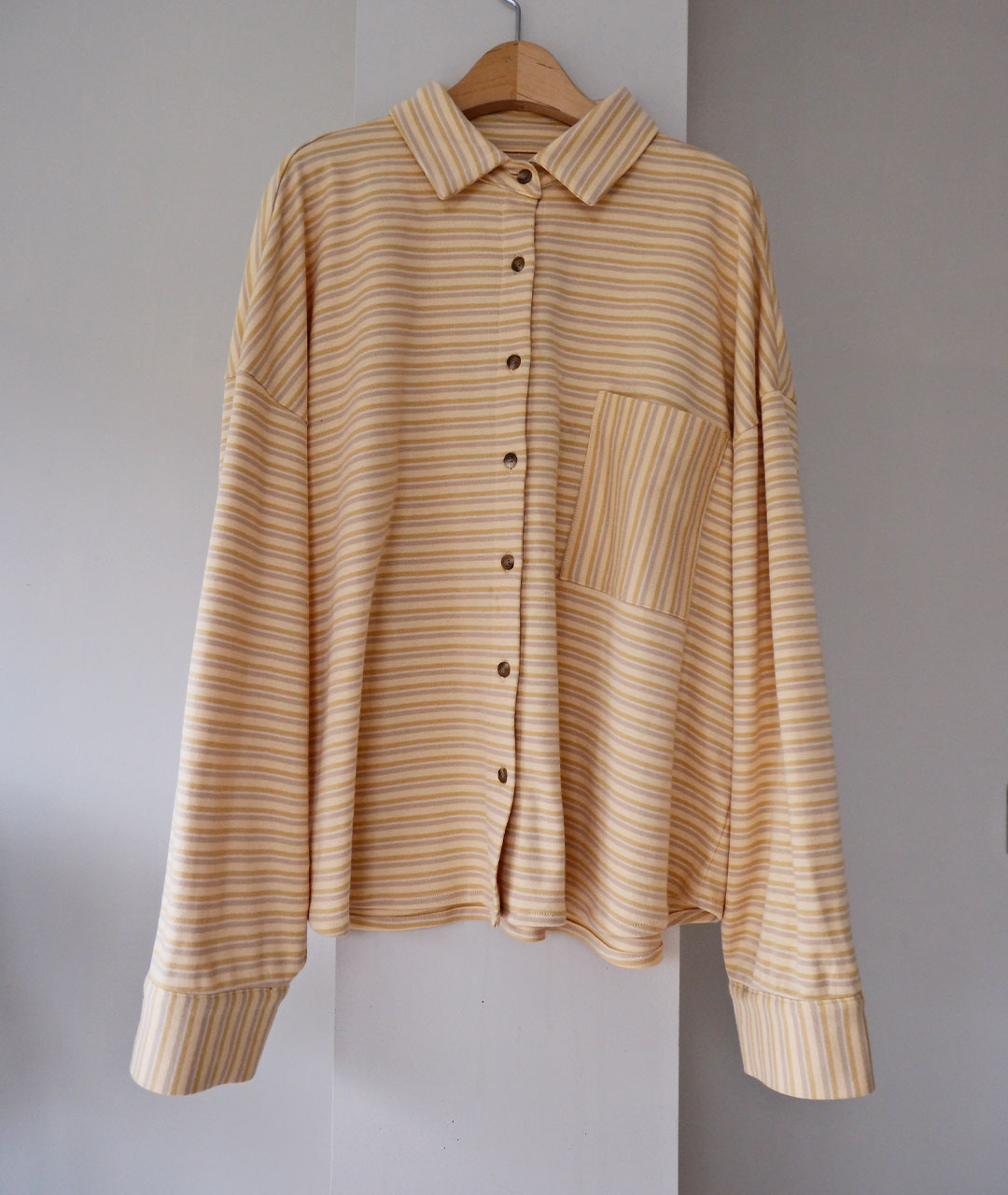 This striped shirt features a soft color mix of butter yellow, light grey, and ivory.