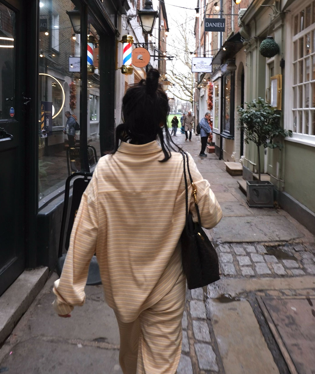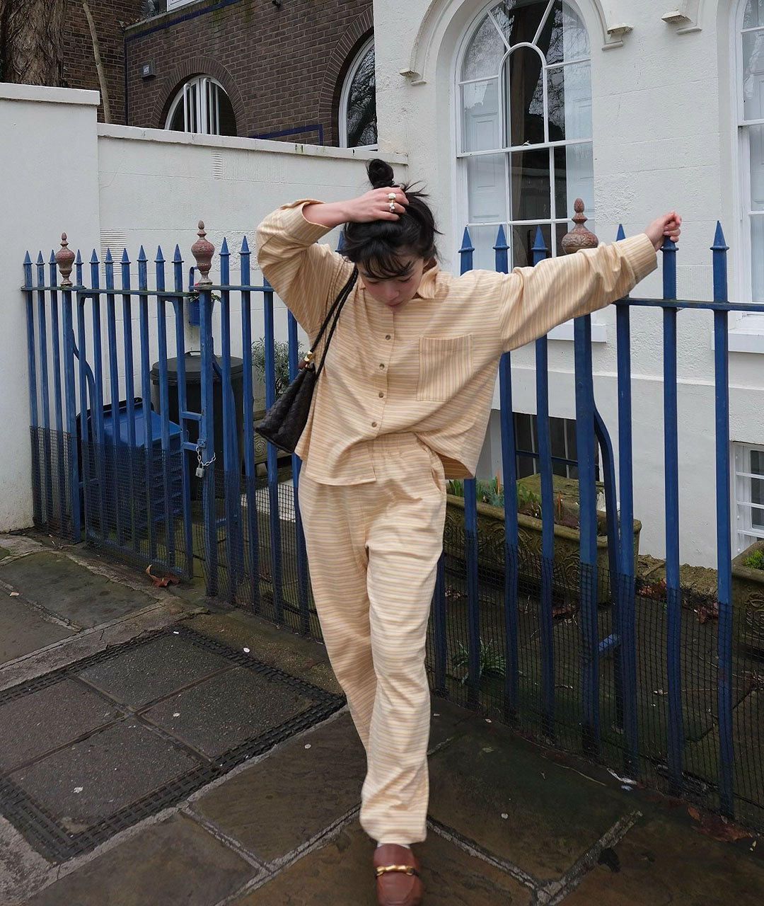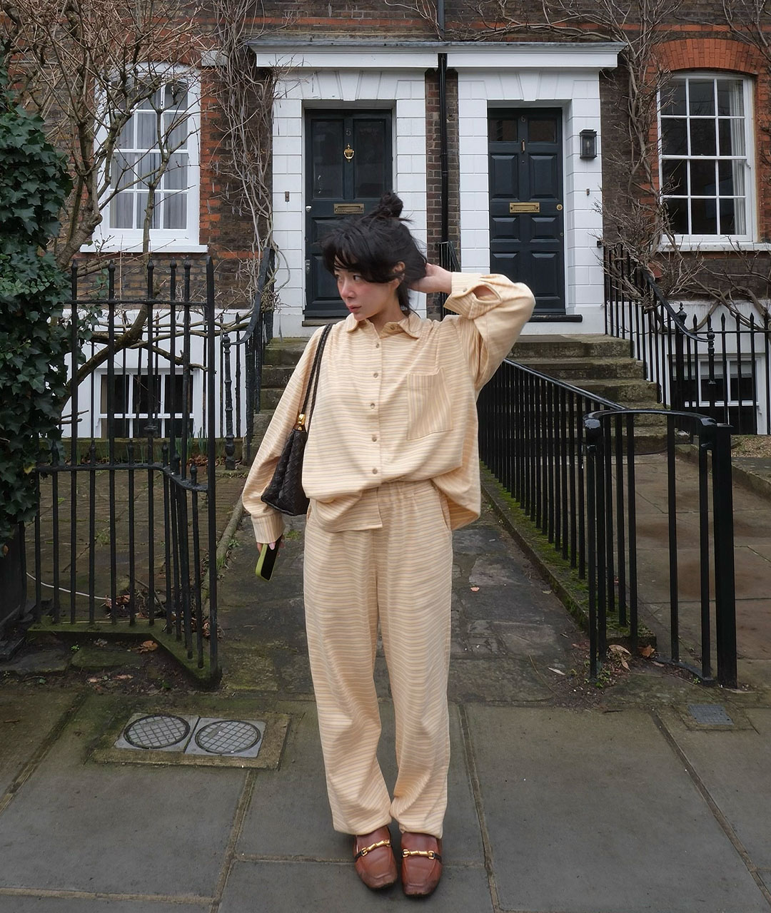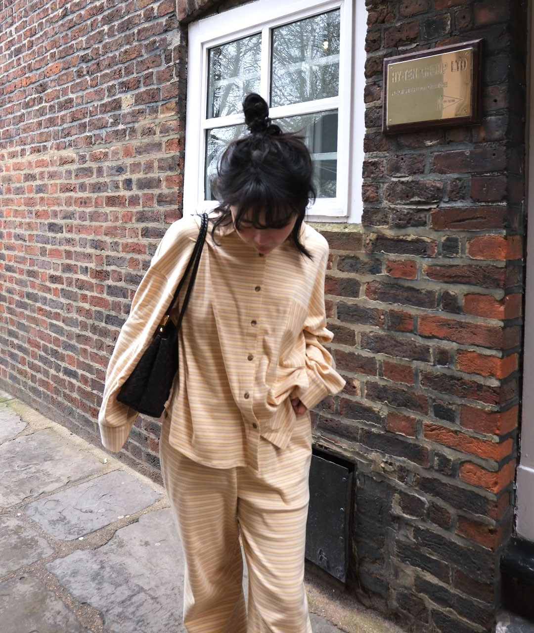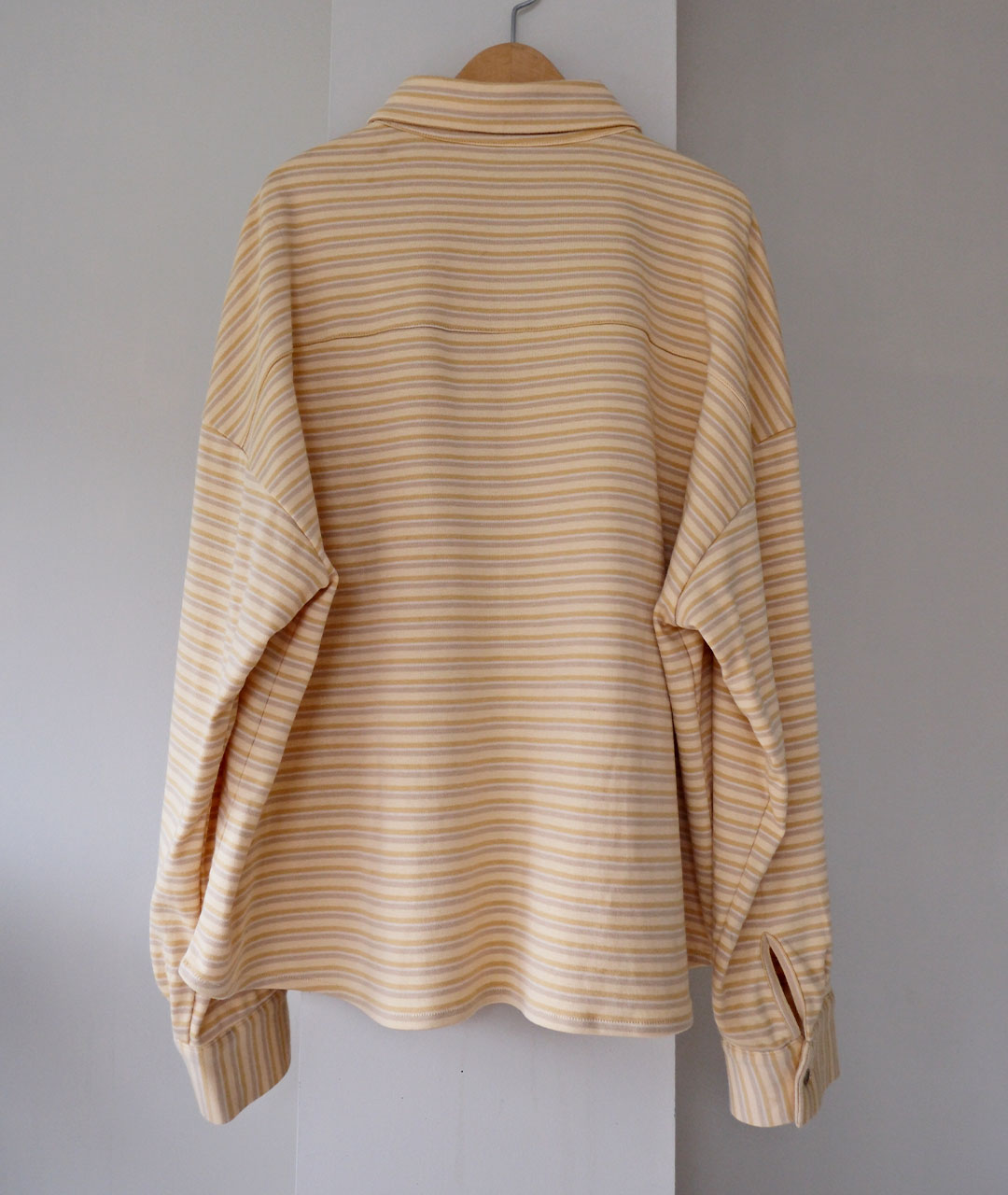 This striped shirt features a soft color mix of butter yellow, light grey, and ivory.