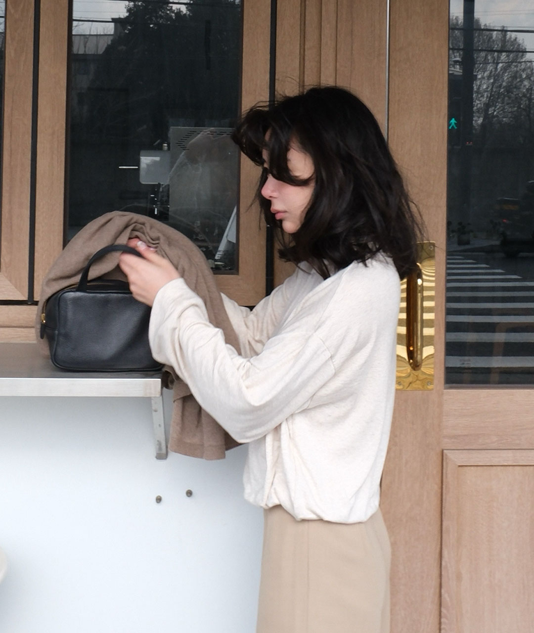 A relaxed top with a soft polo neckline and gentle drape and shirring hems in a warm ivory melange.