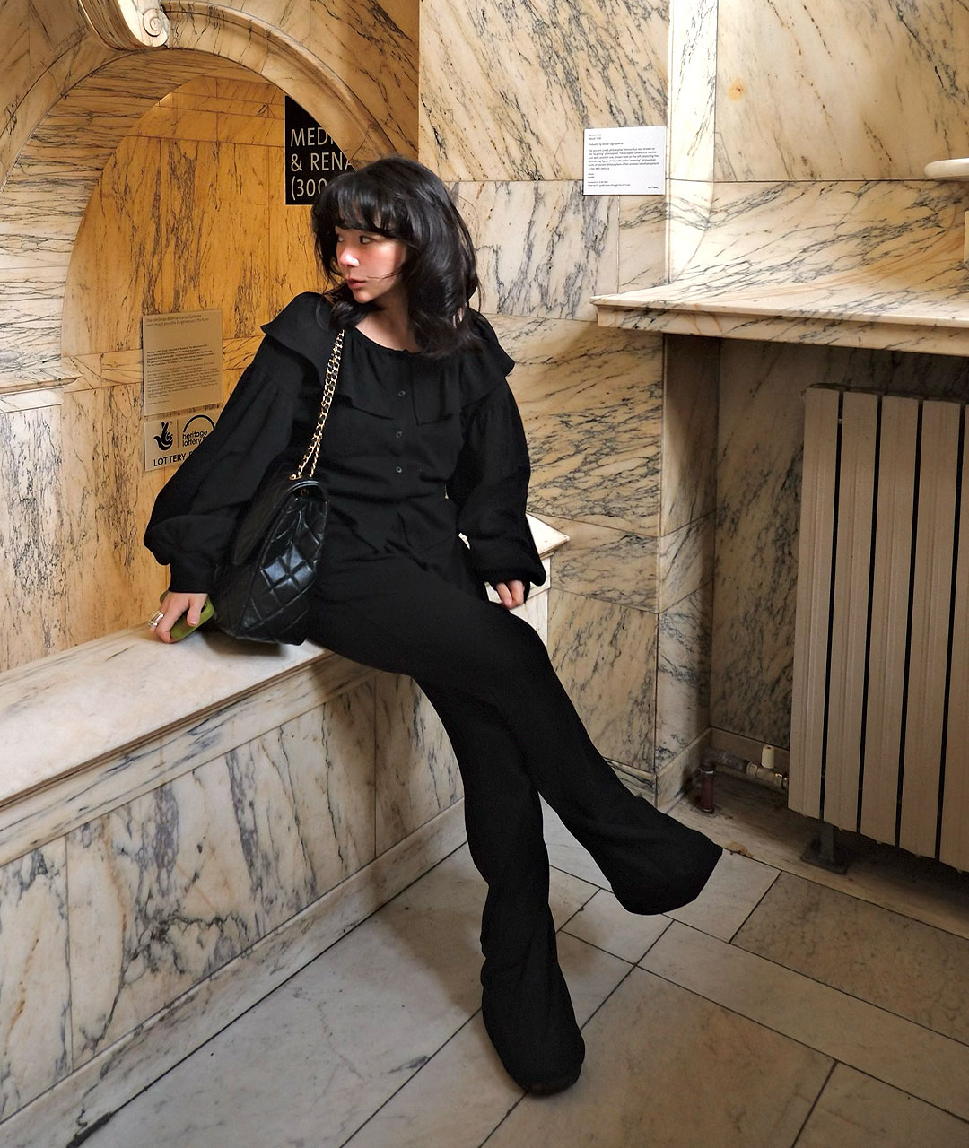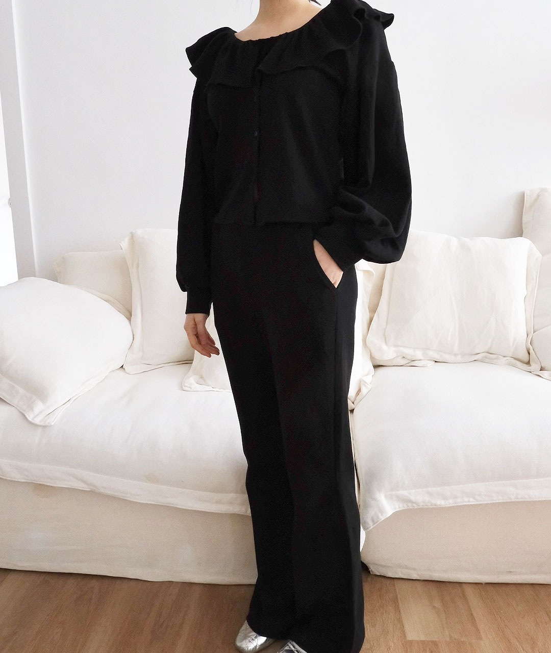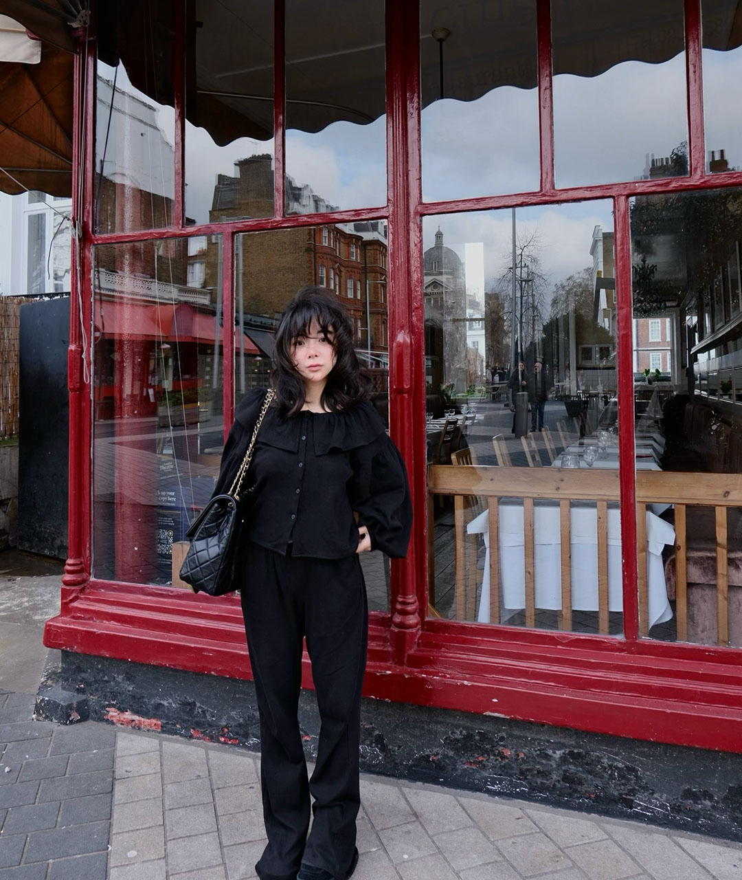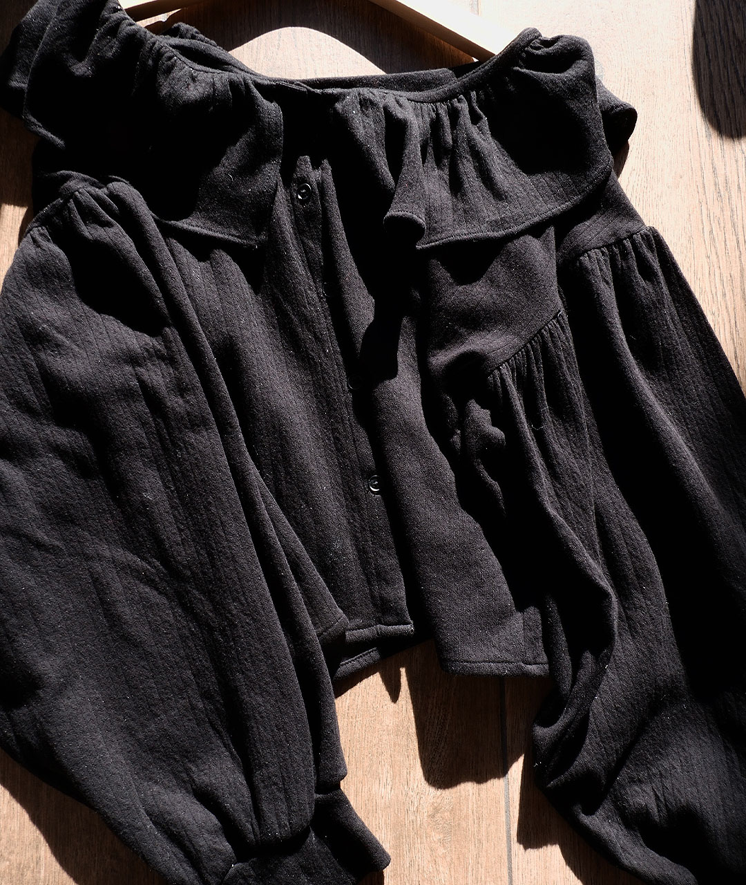 The blouse features a frilled neckline and voluminous sleeves, with pointelle detailing throughout the fabric in black.