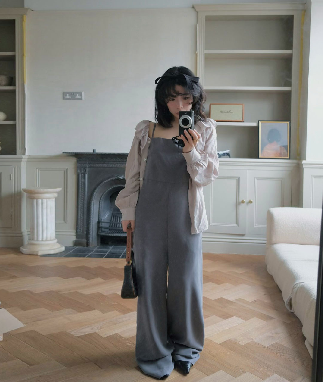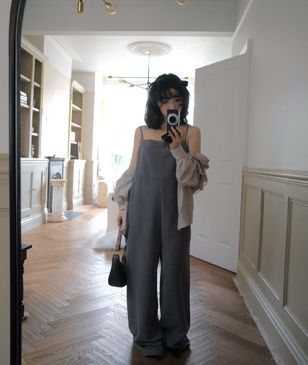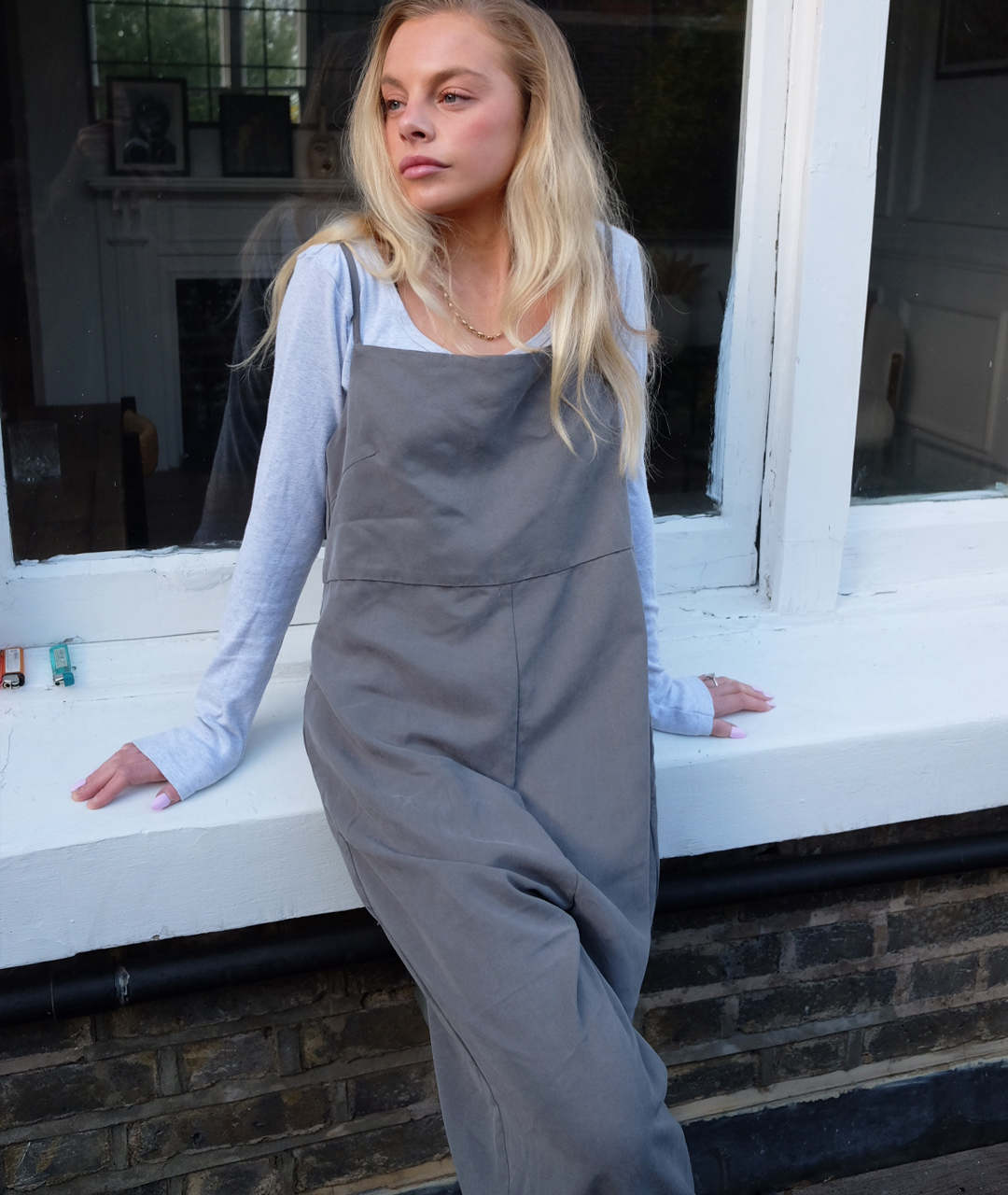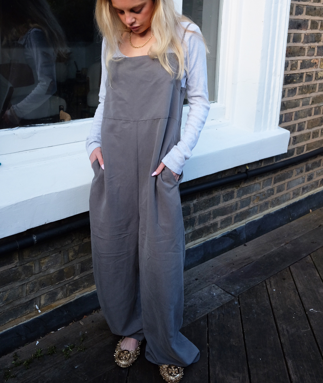 A soft cupro jumpsuit in classic suit grey. It can be worn and styled comfortably for both casual and formal looks.