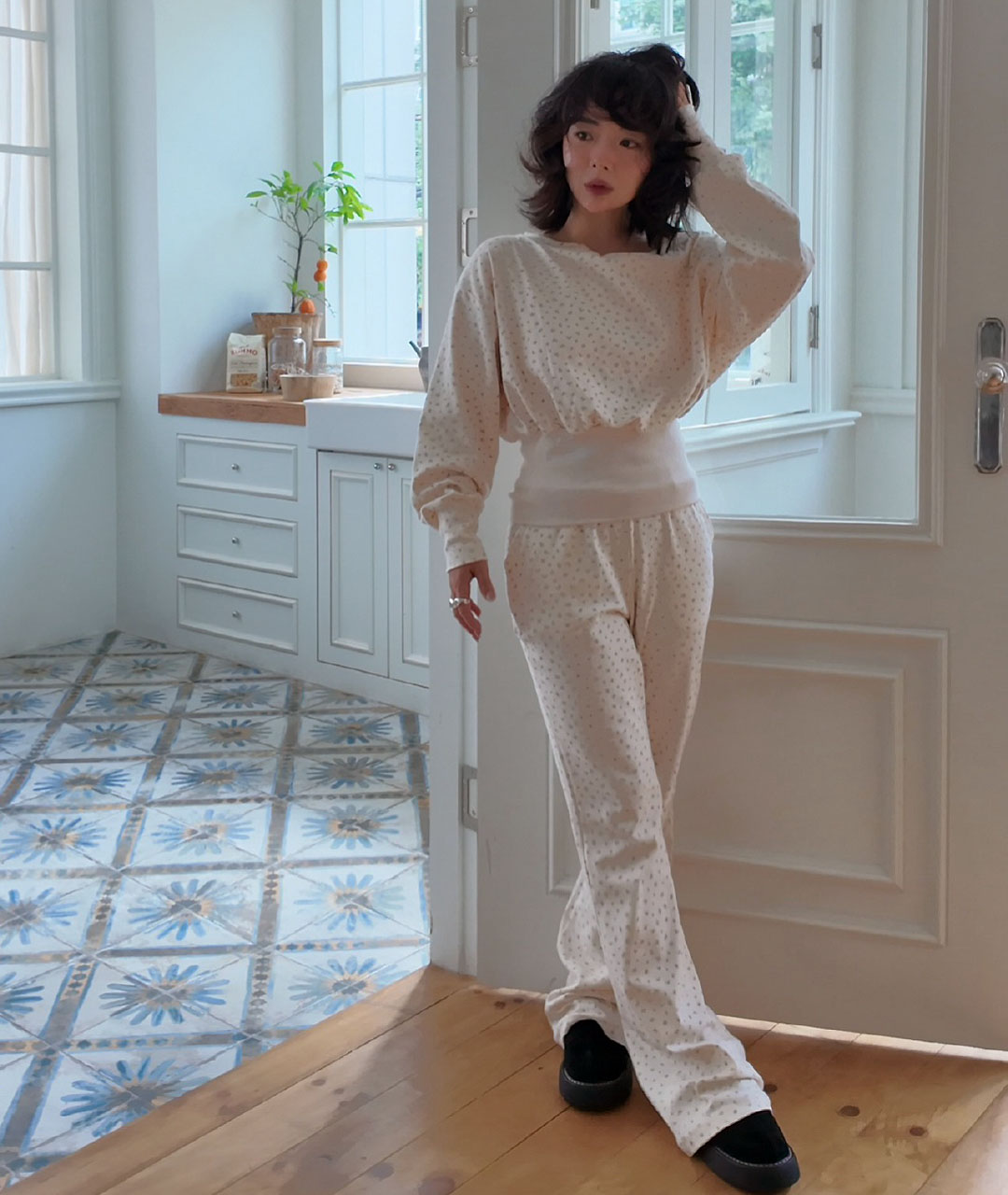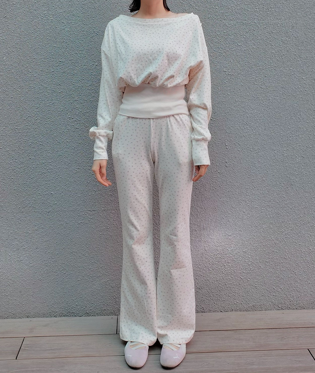The wide neckline can also be styled off the shoulder, can be paired with the matching flared pants.
