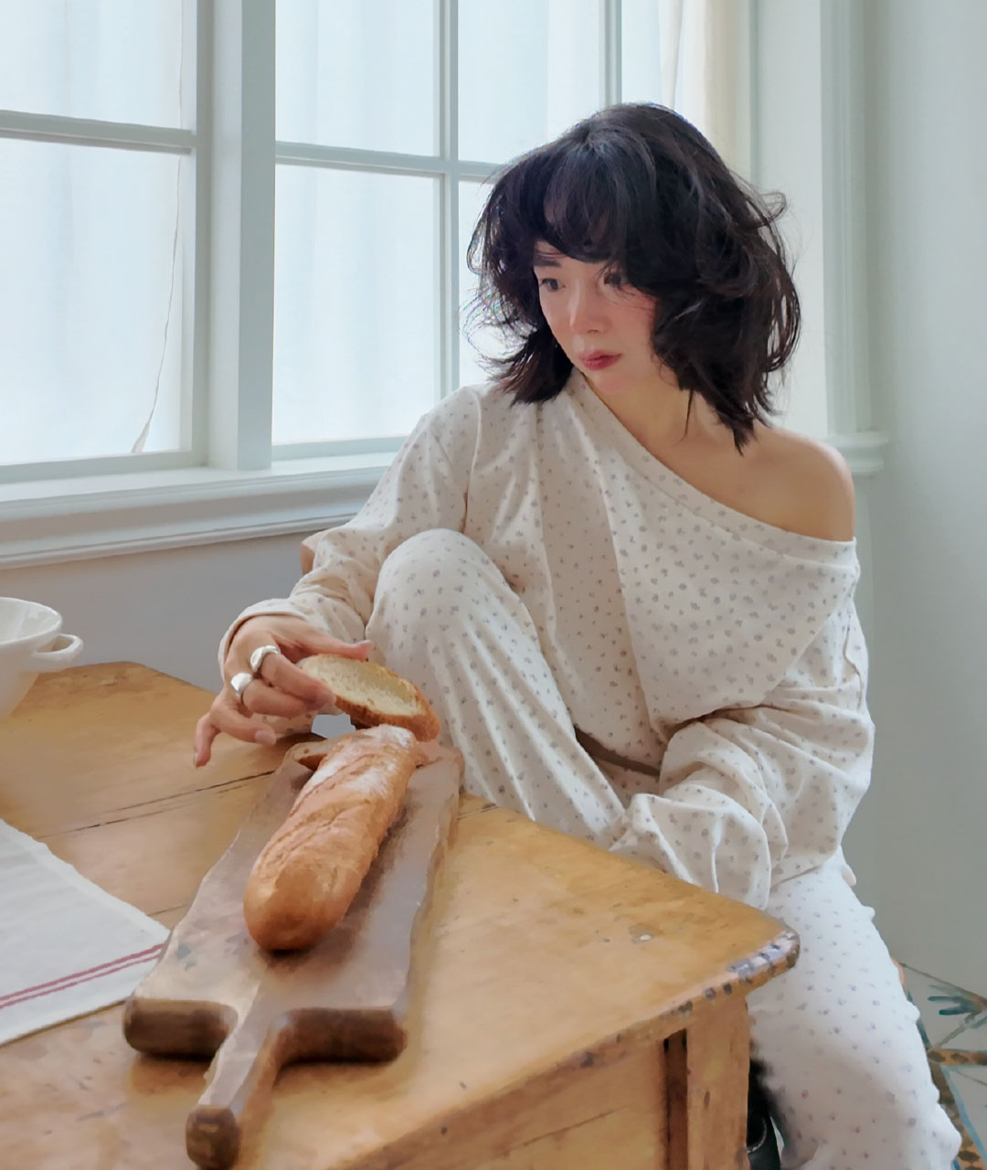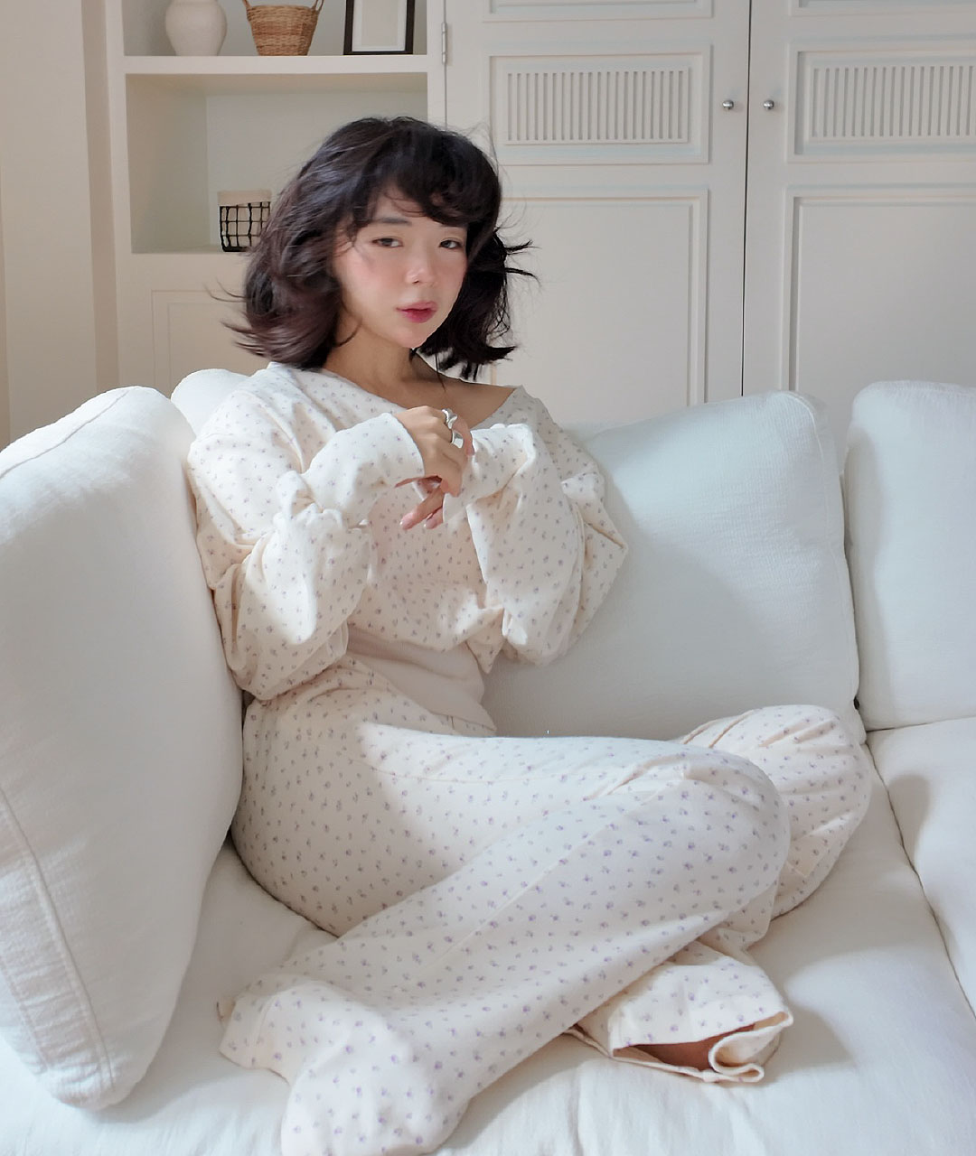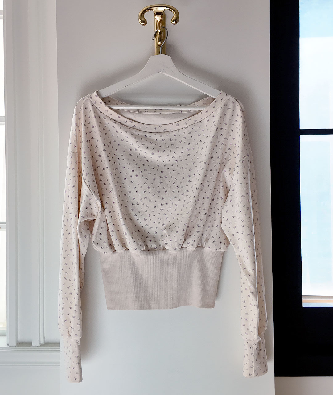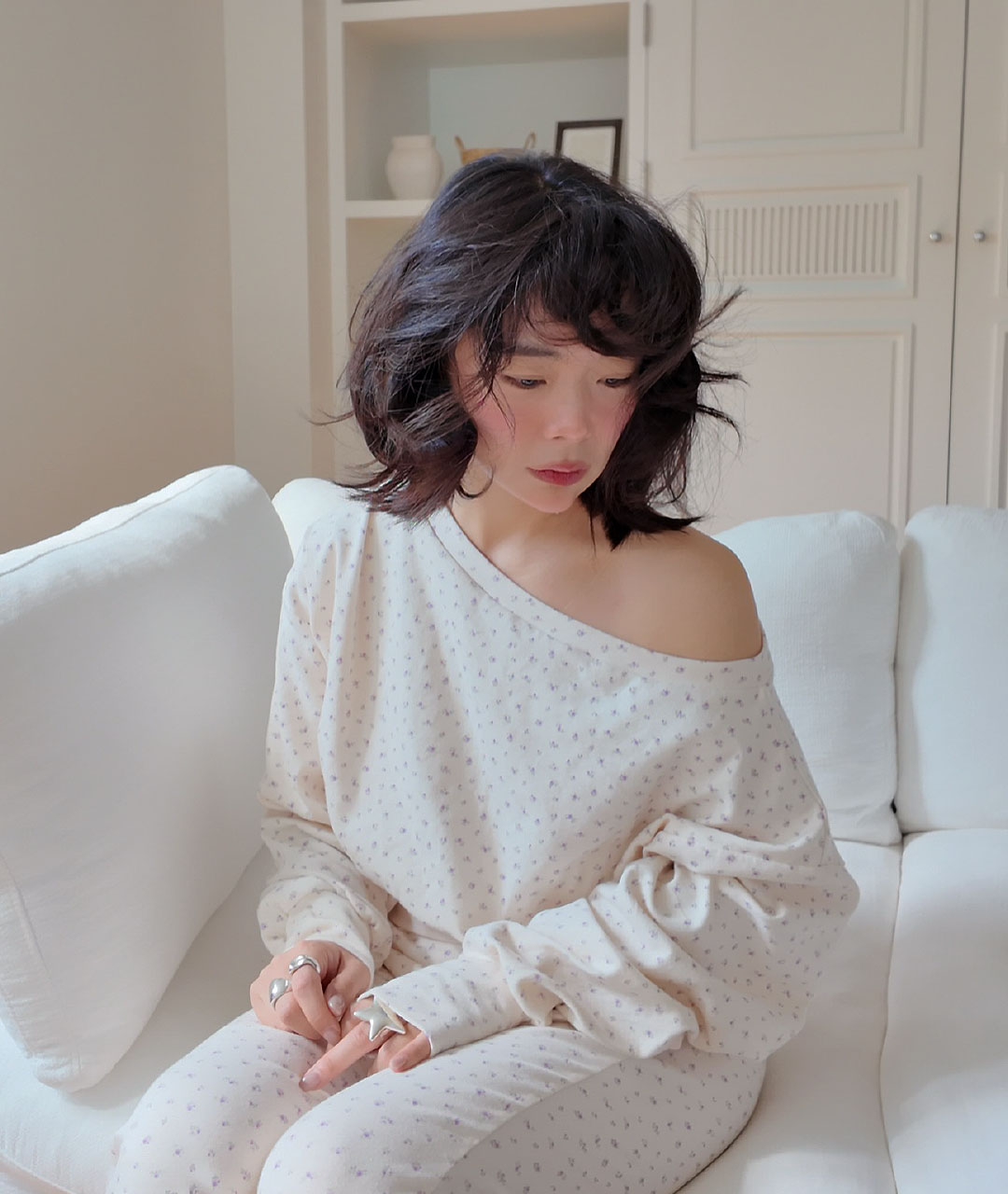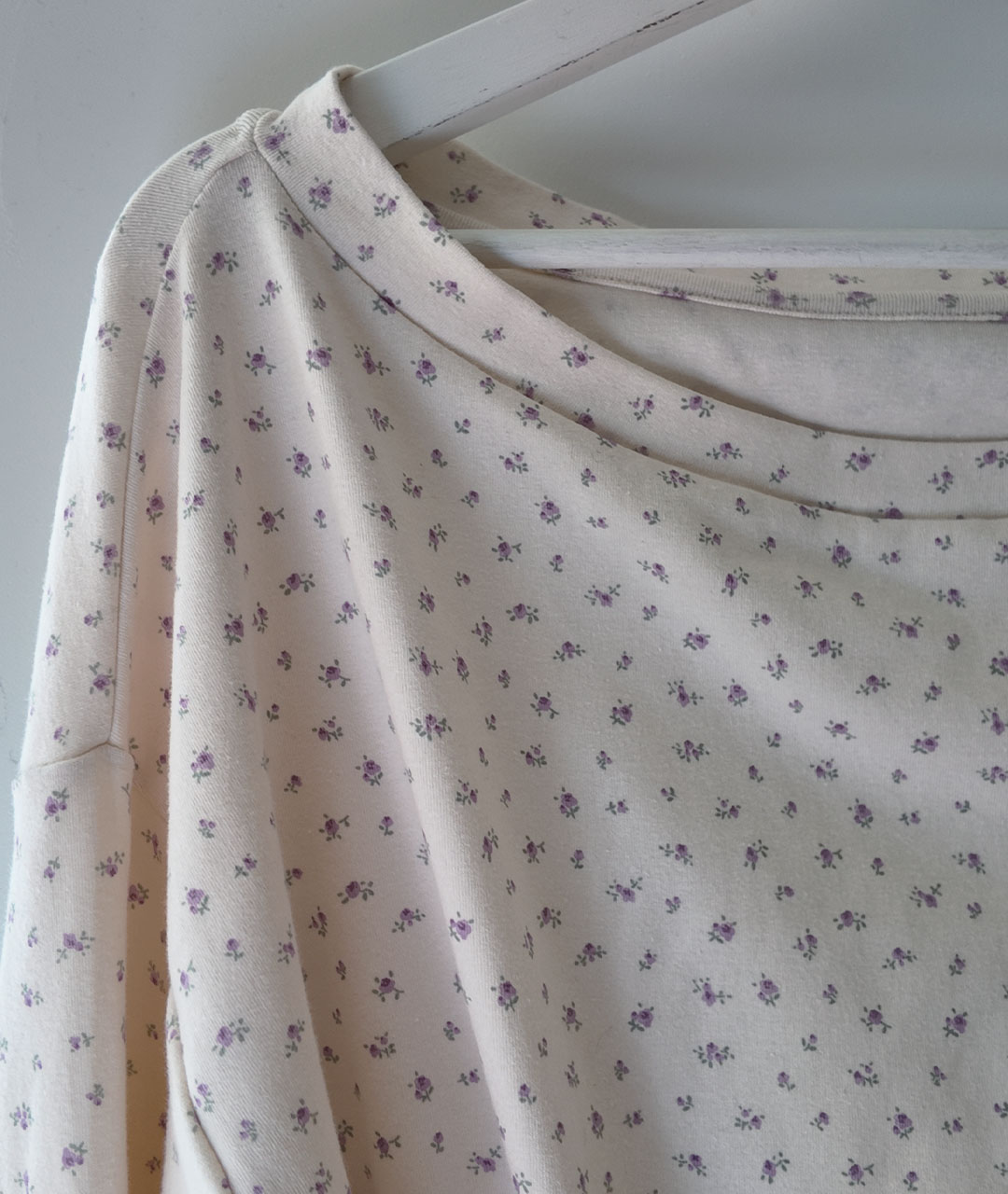 Our popular Signature loungewear off-shoulder top features a delicate purple floral print on soft ivory cotton.
