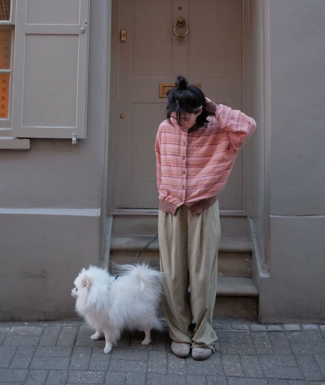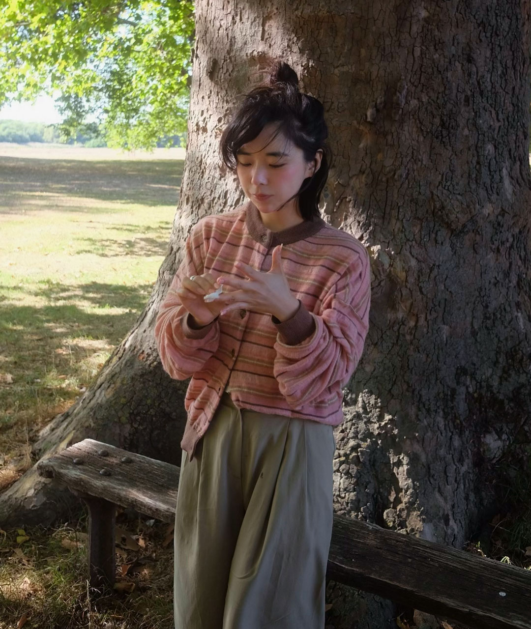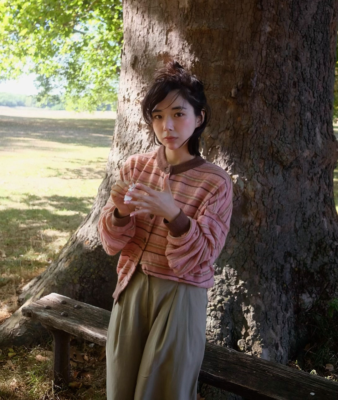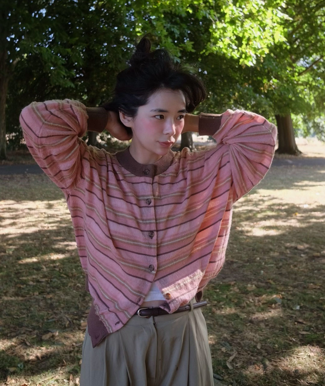 Powdery pink and deep brown tones are reinterpreted in a stripe design with a nostalgic feel.