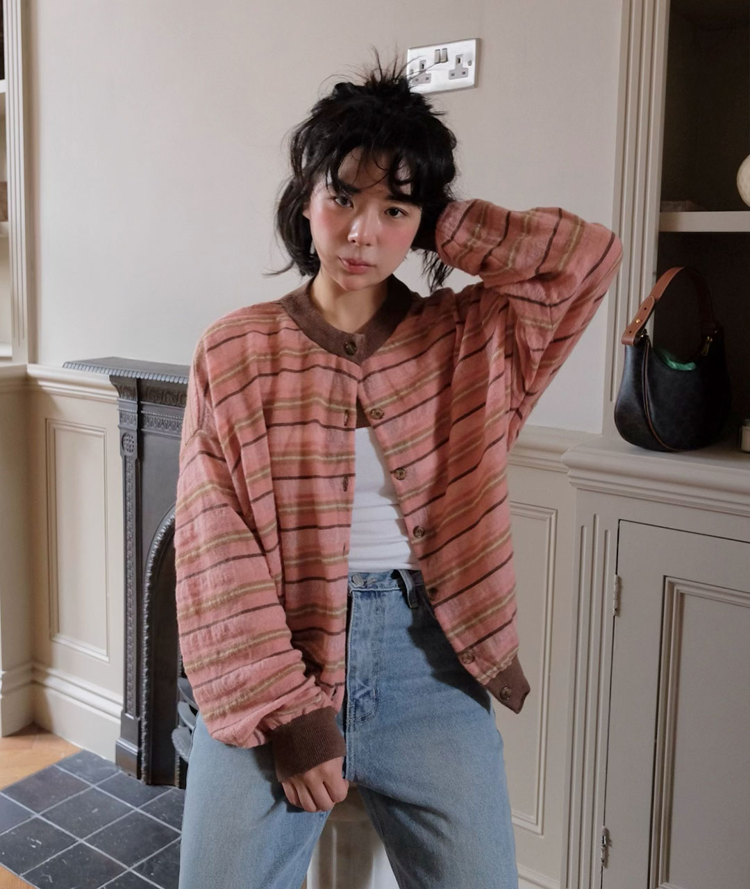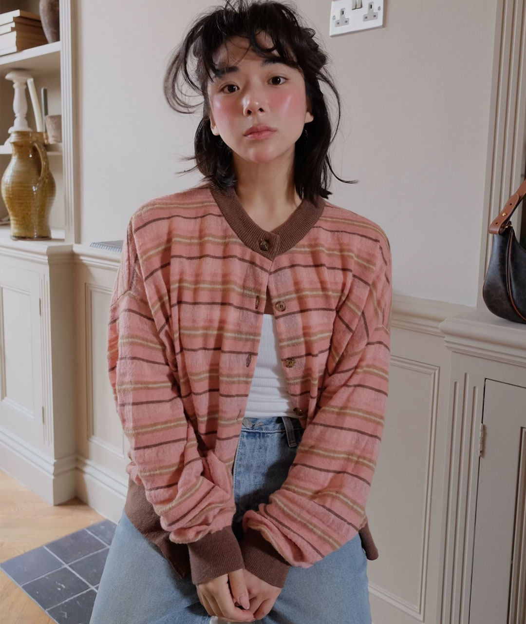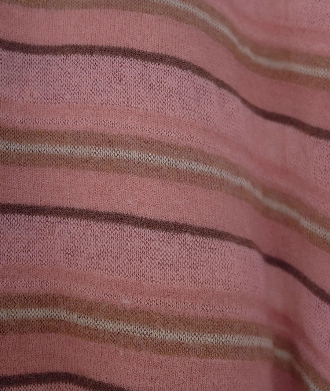 An angora mohair cardigan featuring stripes in a soft blend of powdery tones of pink and brown.